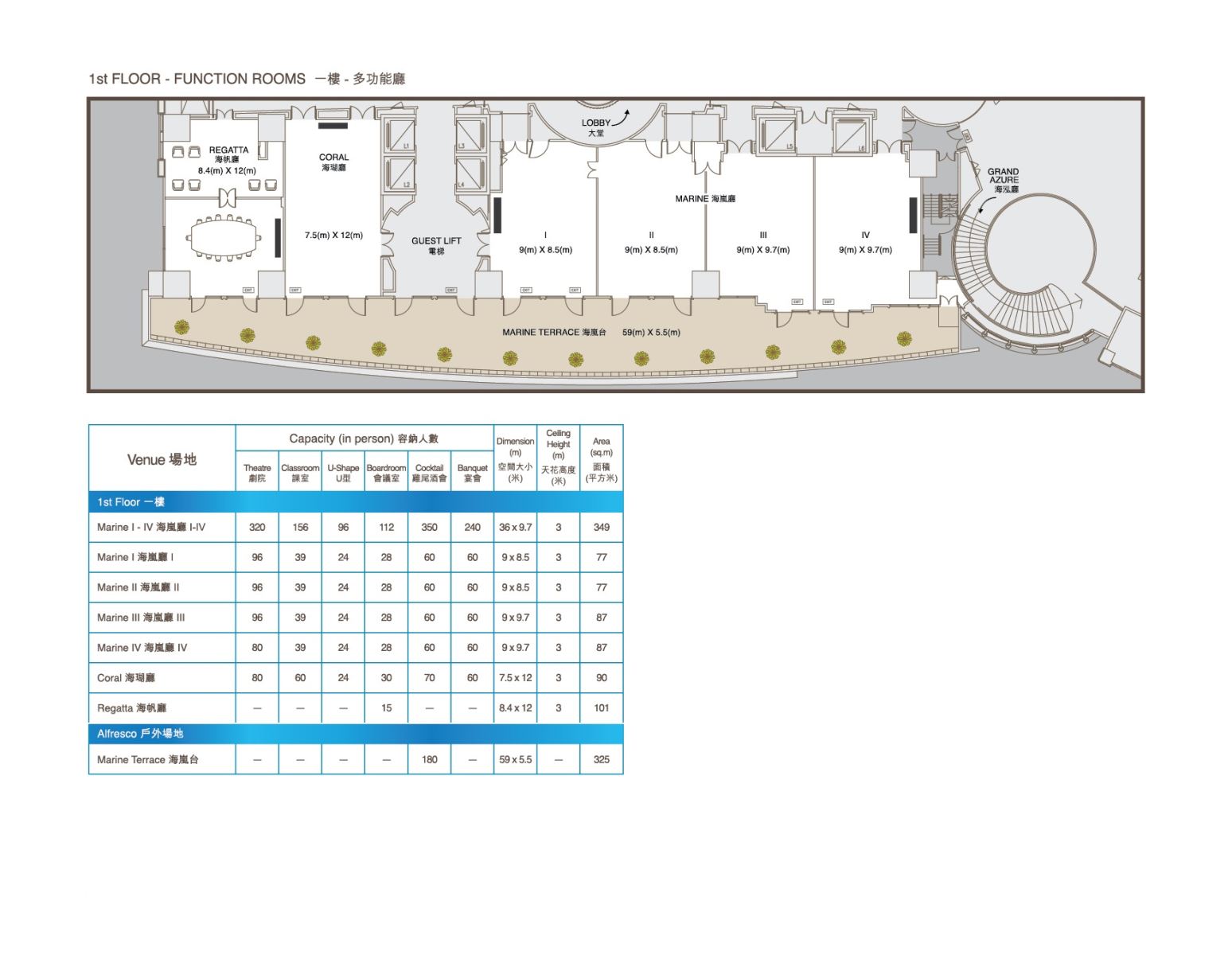 海岚厅空间宽敞,设计灵活,用作举办鸡尾酒会时,可容纳350人,设宴则可款待240人。海岚厅也可根据客人需要而分隔为4个多功能厅,每个皆足以容纳60名宾客享用晚宴。